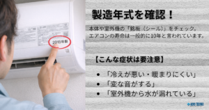 • 製造年式を確認! 本体や室外機の「銘板(シール)」をチェック。エアコンの寿命は一般的に10年と言われています